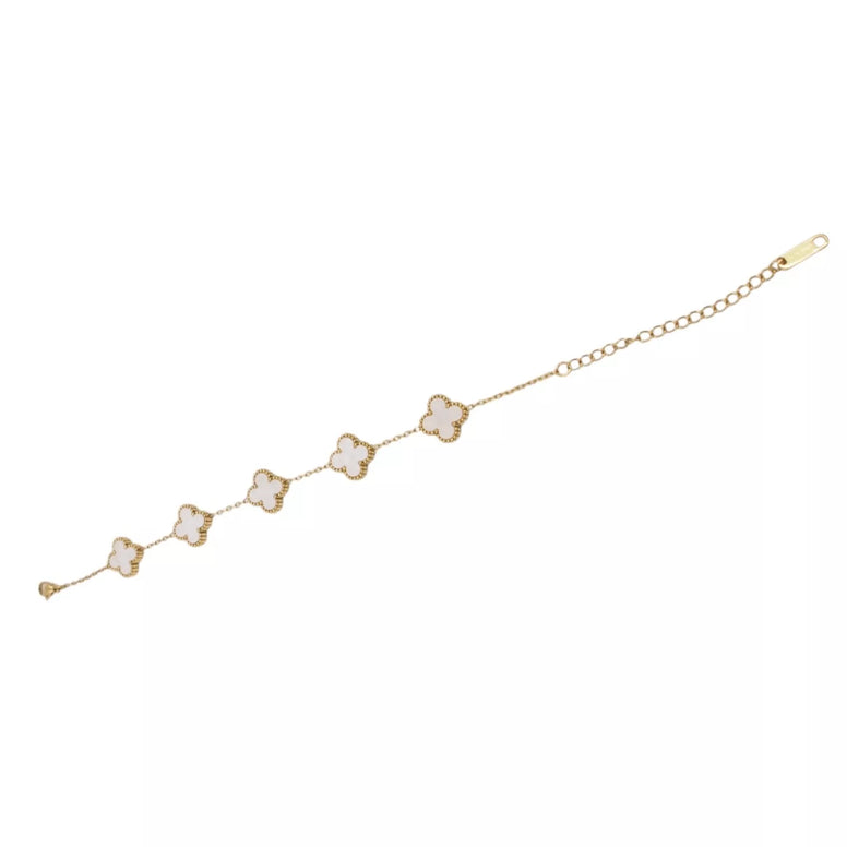 Elegantiška auksinės spalvos apyrankė su penkiais dobilo formos elementais – subtilus aksesuaras, kuris suteiks išskirtinumo tiek kasdieniam, tiek šventiniam įvaizdžiui. Dobilas tradiciškai siejamas su sėkme ir laime, todėl ši apyrankė taps ne tik stiliaus detale, bet ir simboline puošmena.