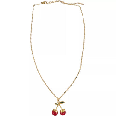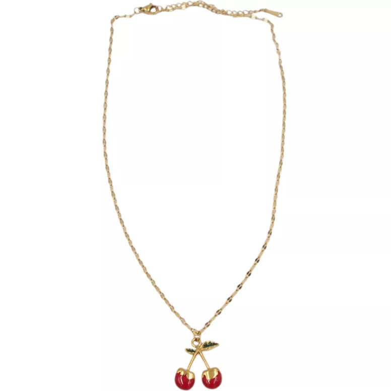 Auksinės spalvos kaklo papuošalas su vyšnių pakabuku