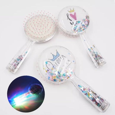 • Šviečiantis LED plaukų šepetys su blizgučiais viduje.