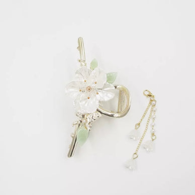 Šis elegantiškas plaukų aksesuaras su didinga gėle suteikia šukuosenai ypatingo žavesio. Šalia žiedo įsitaisęs žėrintis drugelis prideda subtilumo, o krentanti grandinėlė su mažais žiedeliais sukuria lengvumo ir grakštumo efektą. Puikus pasirinkimas norint sukurti rafinuotą ir romantišką įvaizdį.