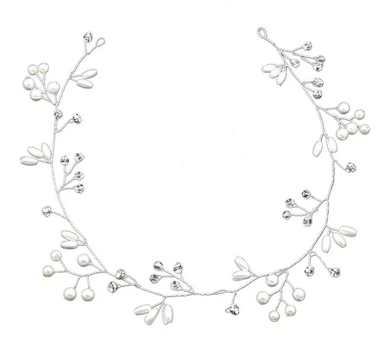 Sidabrinė nuotakos plaukų tiara su perlais. Lankstus viela puikiai priglunda prie prisegtų plaukų.