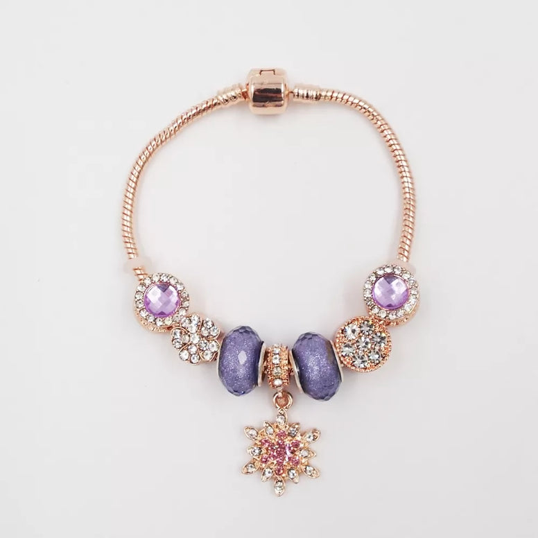 Ši žavinga apyrankė spinduliuoja švelnumą ir eleganciją. Rožiniai ir violetiniai atspalviai sukuria harmoningą derinį, suteikiantį aksesuarui subtilaus prabangos pojūčio. Dekoratyviniai karoliukai su blizgančiomis detalėmis ir simboliniais pakabukais prideda apyrankei išskirtinumo bei asmeniškumo.