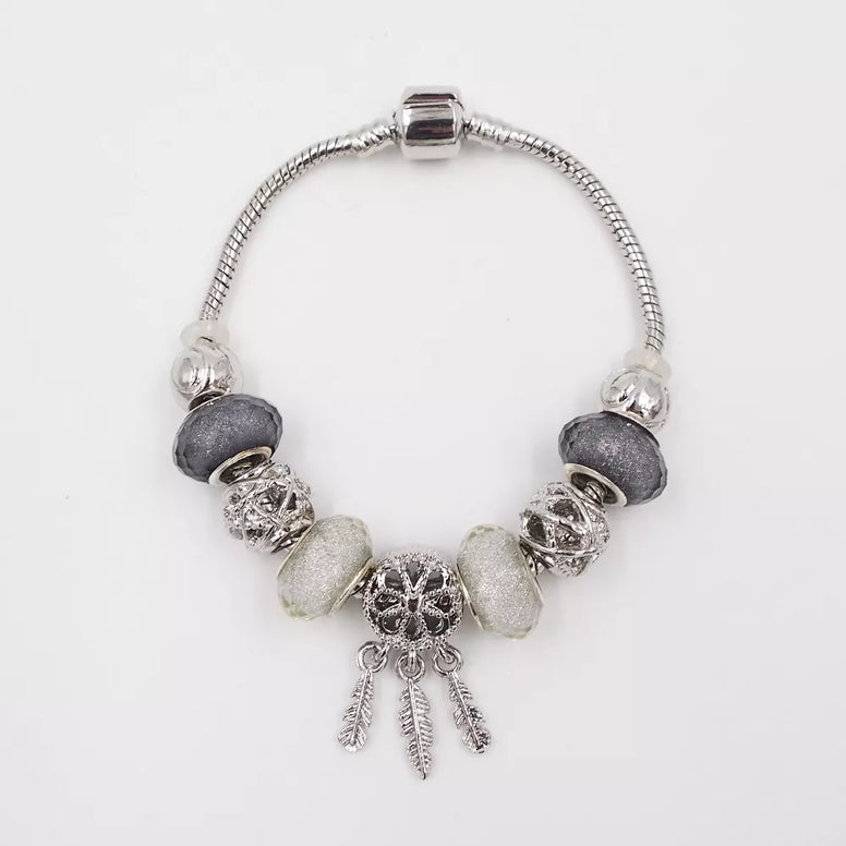 Ši subtili ir rafinuota apyrankė spinduliuoja klasikinę eleganciją. Sidabrinės spalvos pagrindas harmoningai dera su baltais ir pilkais akcentais, suteikdamas aksesuarui išskirtinio švelnumo ir prabangos pojūtį. Blizgantys dekoratyviniai karoliukai ir kruopščiai parinkti pakabukai suteikia apyrankei unikalumo bei modernumo.