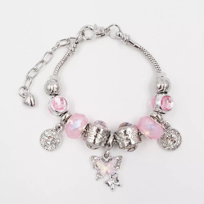 Ši elegantiška sidabrinės spalvos apyrankė spinduliuoja švelnumą ir moteriškumą. Rožiniai akcentai suteikia jai romantiško žavesio, simbolizuodami meilę, šilumą ir harmoniją. Išskirtinis drugelio pakabukas reiškia pokyčius, lengvumą ir naują pradžią, todėl ši apyrankė gali tapti ypatingu talismanu.