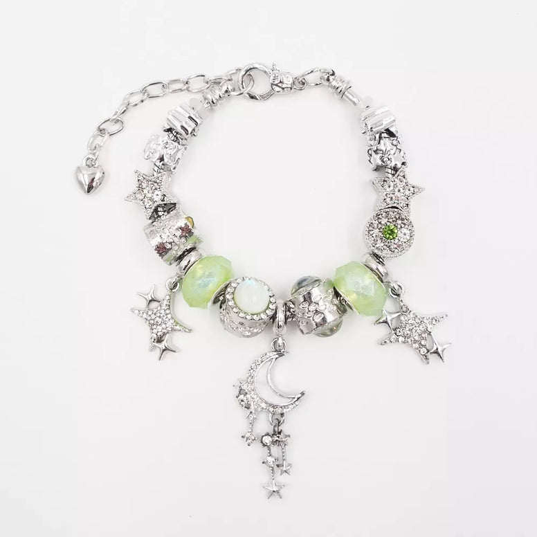 Ši subtili apyrankė spinduliuoja gaivumu ir rafinuotumu. Sidabrinės spalvos pagrindas puikiai dera su šviesiai žaliais akcentais, kurie simbolizuoja atsinaujinimą, ramybę ir pusiausvyrą. Blizgantys dekoratyviniai karoliukai suteikia aksesuarui lengvumo ir elegancijos, o išskirtiniai pakabukai prideda individualumo.