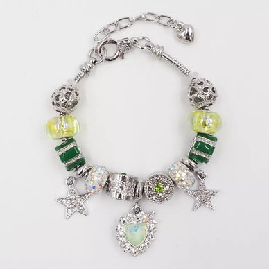 Ši elegantiška apyrankė sujungia sidabrinės spalvos rafinuotumą ir gaivius žalius akcentus, simbolizuojančius harmoniją, gamtą ir atsinaujinimą. Blizgantys dekoratyviniai karoliukai suteikia aksesuarui subtilaus spindesio, o unikalūs pakabukai prideda ypatingo žavesio.