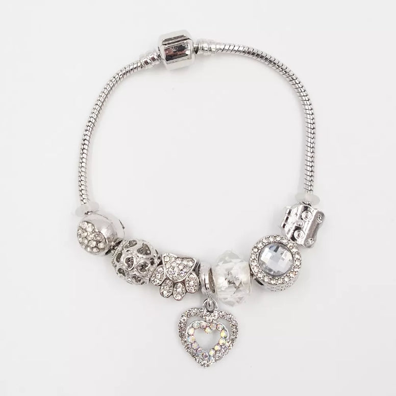 Sidabrinės spalvos apyrankė su žėrinčiais pakabukais