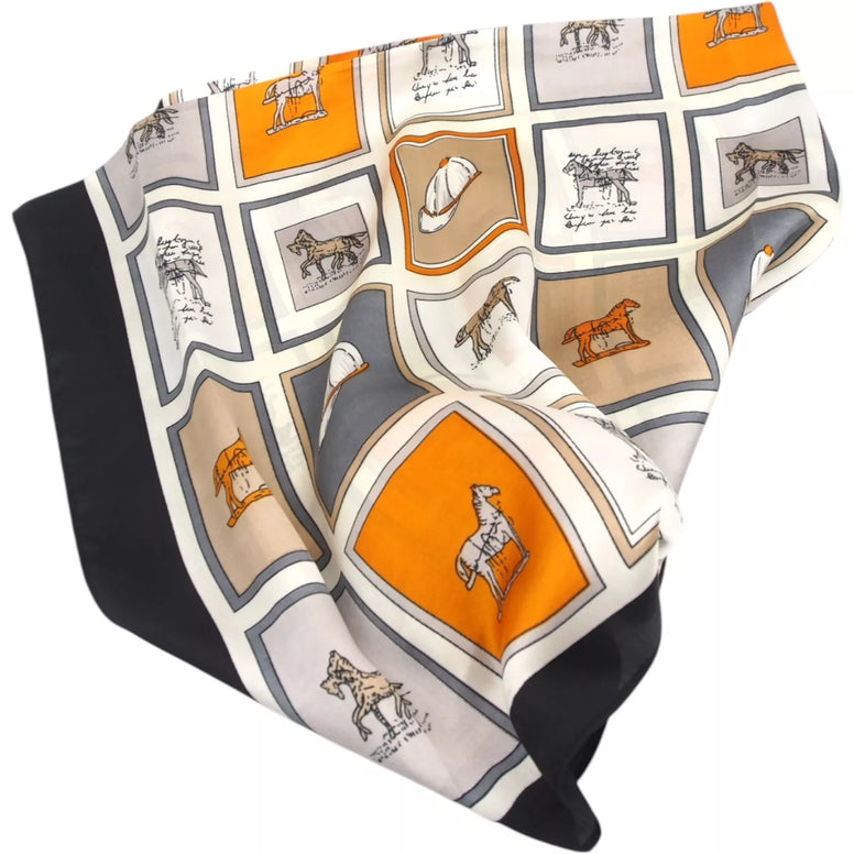 Prabangiai atrodanti skarelė – puikus aksesuaras ieškančioms išskirtinumo. Ryškių oranžinių, pilkų ir rusvų spalvų derinys su žirgų bei jojimo tematikos motyvais sukuria išskirtinį, klasikinį įvaizdį. Puikiai dera tiek prie elegantiškos aprangos, tiek kaip akcentas kasdieniame stiliuje – galima rišti ant kaklo, plaukų ar rankinės rankenos.
